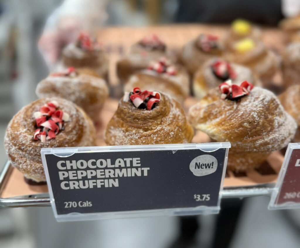 Chocolate Peppermint Cruffin – Layers of buttery croissant dough, chocolate peppermint cream, and chocolate curls on top. What a tasty and sweet treat for a holiday breakfast or brunch!