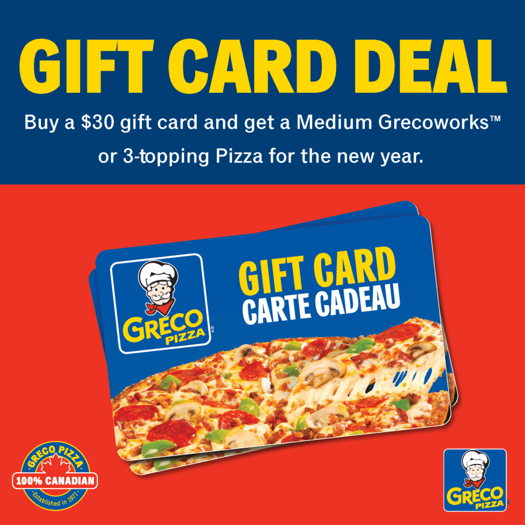 Gift Card Deal – Buy a $30 gift card and get a medium Grecoworks or a 3-topping pizza for the new year.