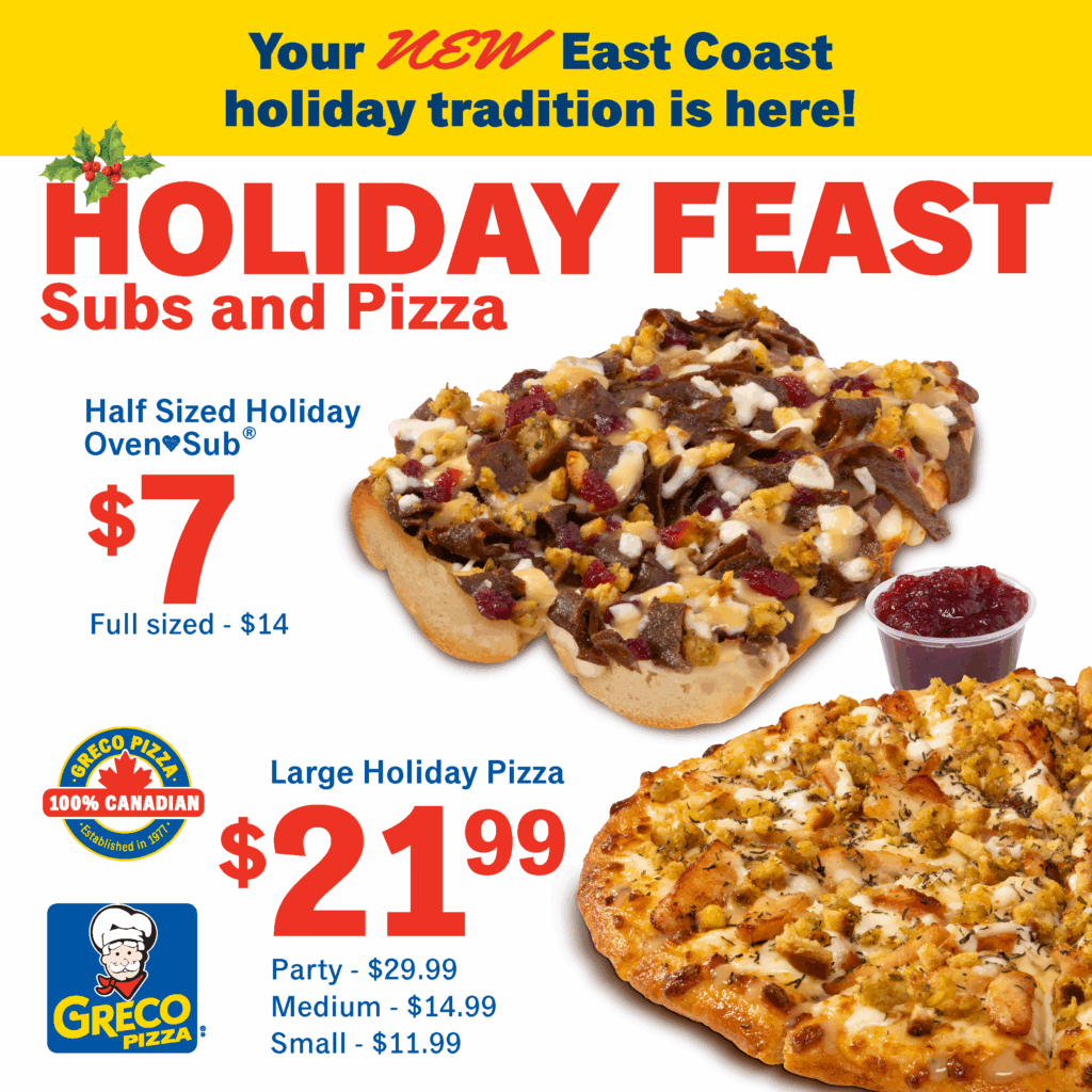 Holiday Feast – Your new East Coast holiday tradition is here! Half sized holiday sub for $7 and a large holiday pizza for $21.99