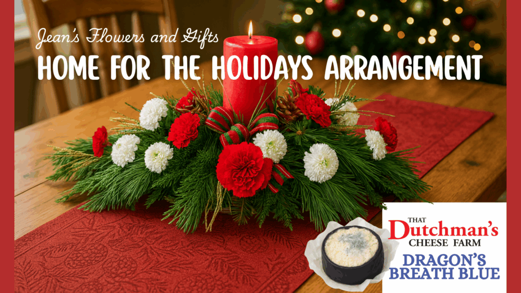 Home for the Holidays Arrangement – Share all of your holiday memories around this stunning centerpiece of long lasting carnations, ball mums and winter greens.