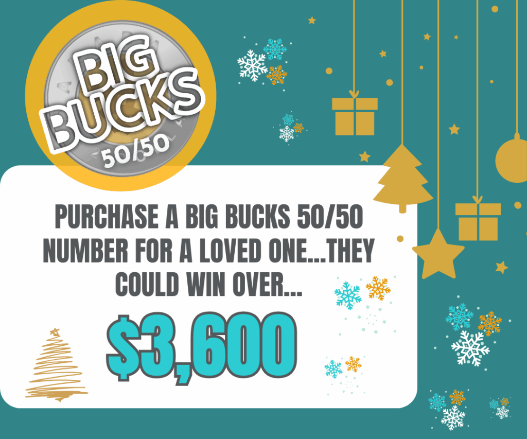 Big Bucks 50/50 Tickets – Big Bucks 50/50 holiday cards ready! A wonderful local, community-minded gift for a loved one. Give the gift that gives a chance at an est. $3,600 every week AND supports local young people in our community.