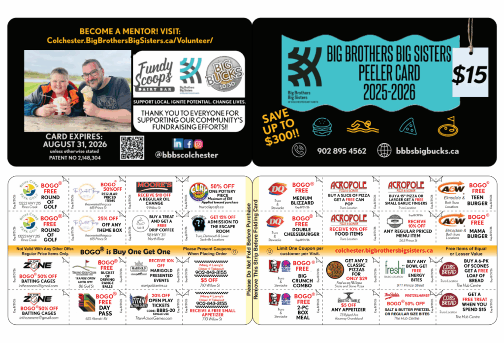 Peeler Card – Each card features deals and discounts on local food and entertainment! For the small sum of $15, cardholders receive up to $300 in savings! By purchasing a BBBS peeler card, you are encouraging local businesses as well as vulnerable youth to thrive despite the challenging times.